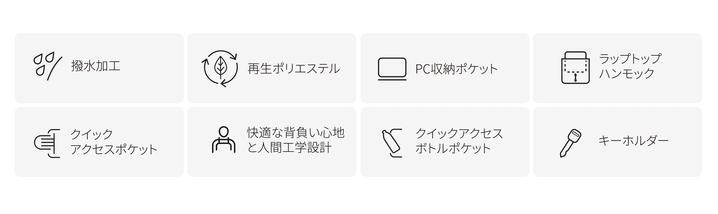 このバッグは撥水性のリサイクルポリエステル生地でできています。この素材はリサイクルプラスチックボトルから製造された、耐久性に優れた環境に配慮したものです。